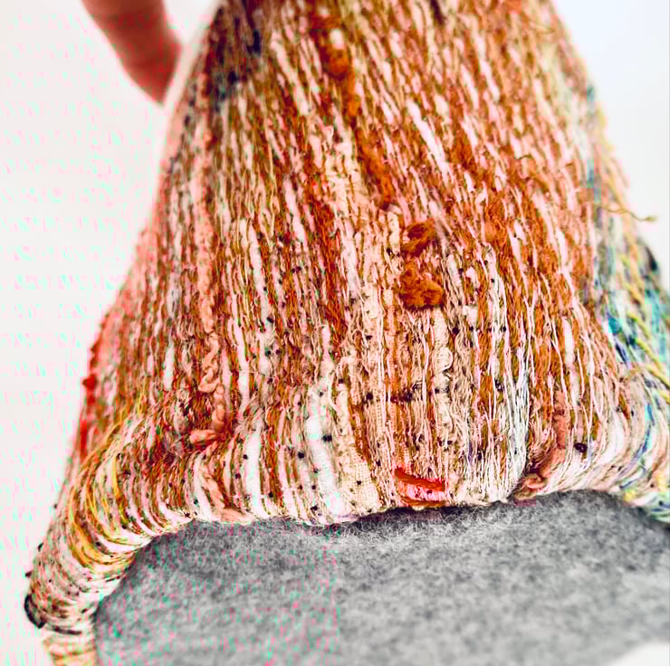 The base fabric of wool has been overlaid with mixed fabrics then embroidered over the top, it has a strong cotton lining. The outer base is wool and the base lining is made from recycled wet suit fabric.