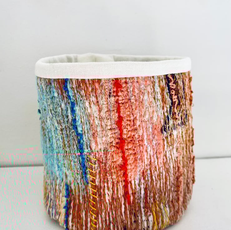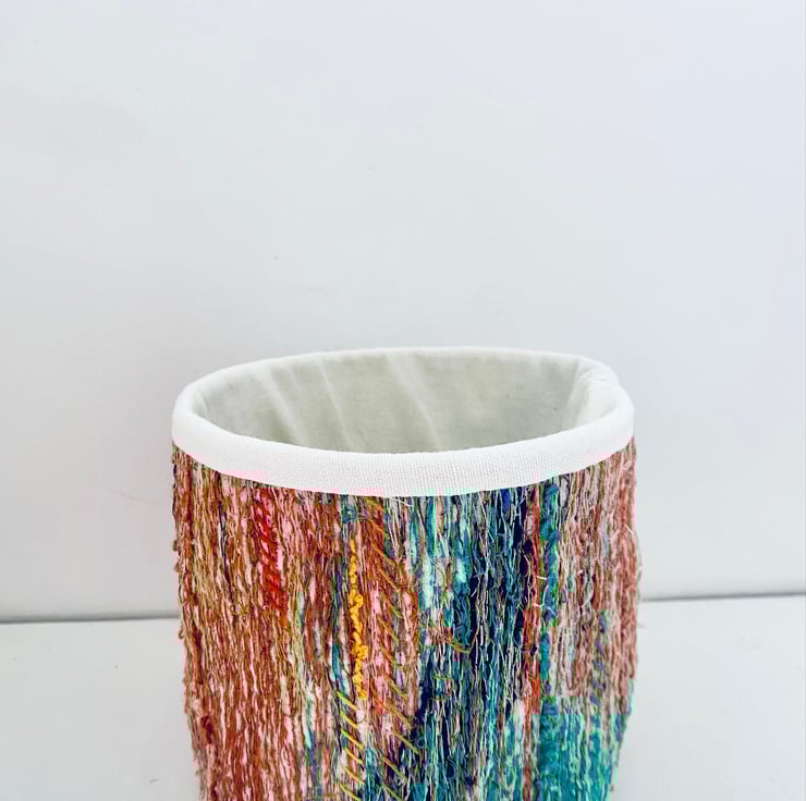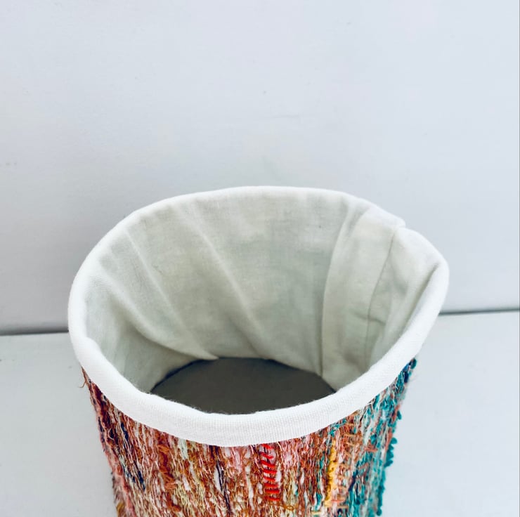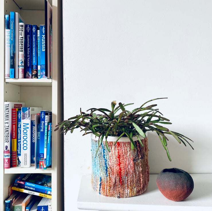 A unique and decorative pot. Made with a mix of preloved fabrics, with vibrant colours of orange and aquamarine there’s a bit of a Moroccan vibe about this one.
