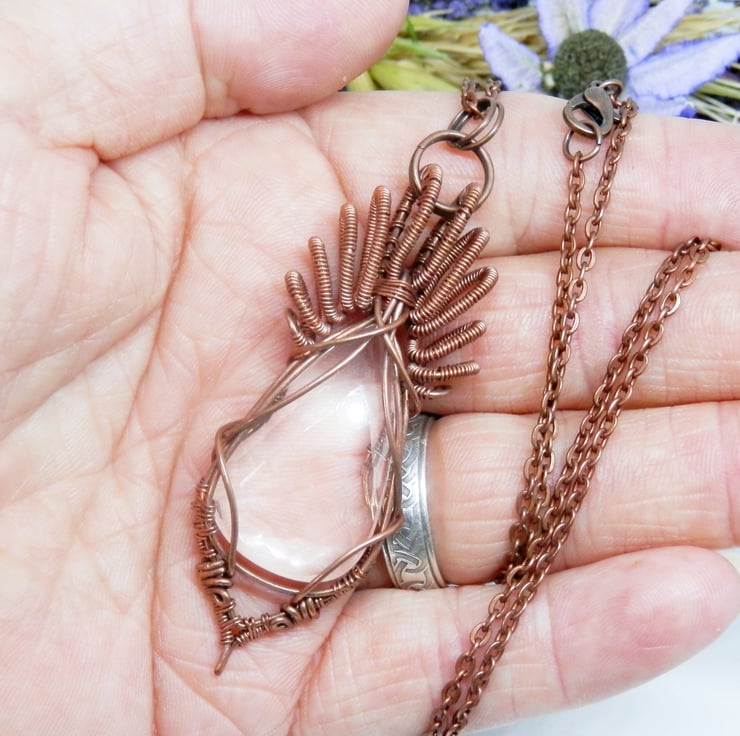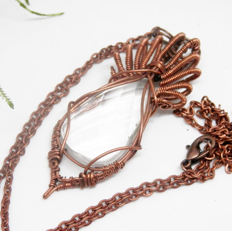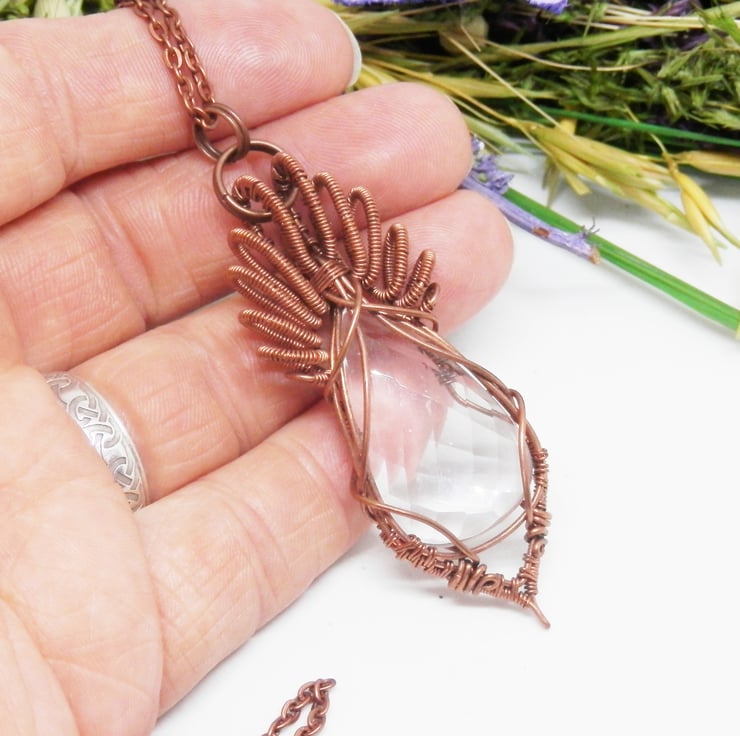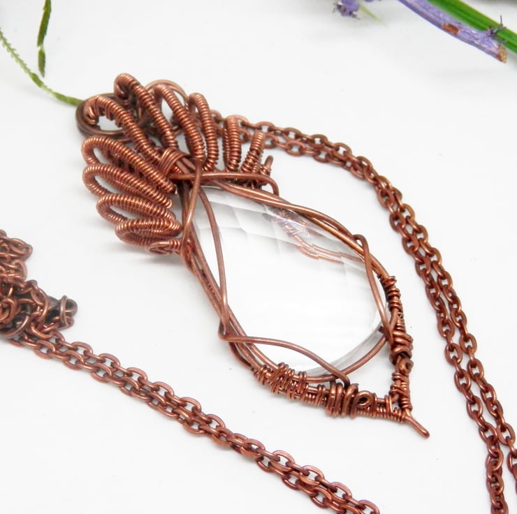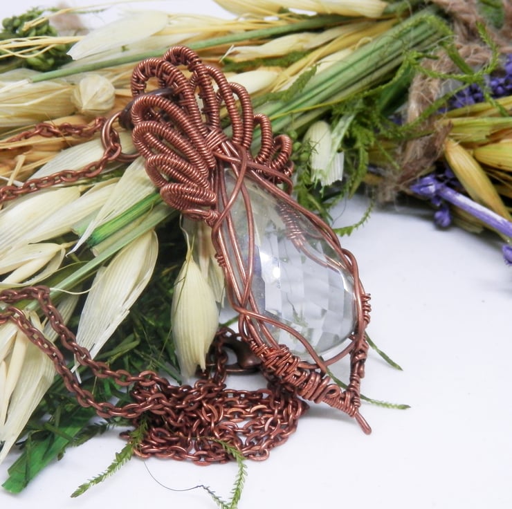 This is a stunning wire wrapped Necklace, made using copper wire that has been wrapped lovingly around a teardrop shaped faceted Clear Quartz cabochon that glistens as it catches the light. I have added lots of lovely swirly bits for the bail.