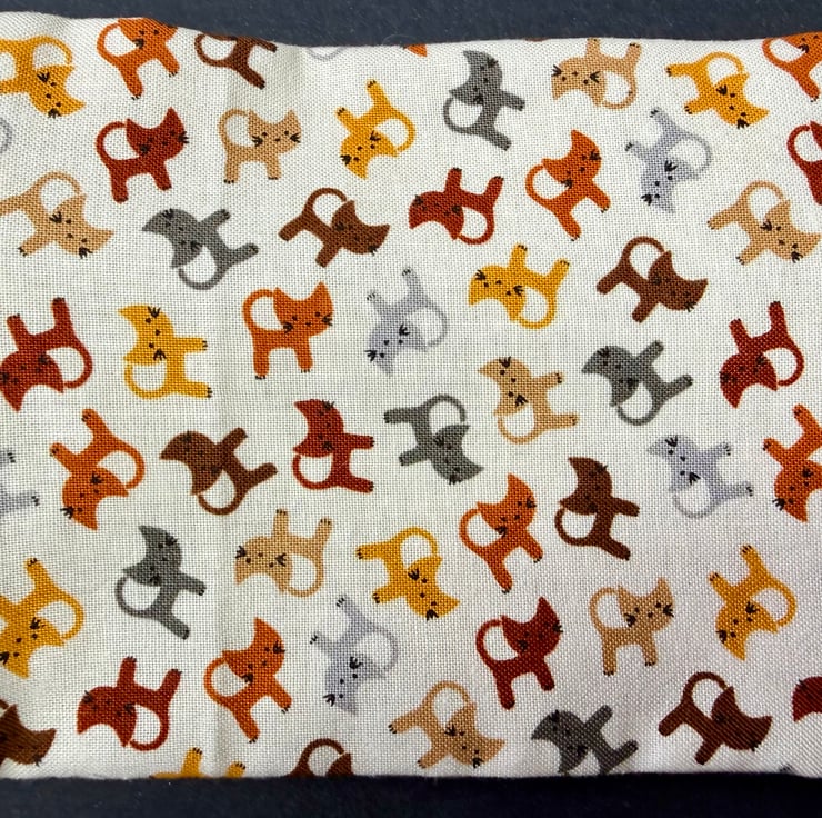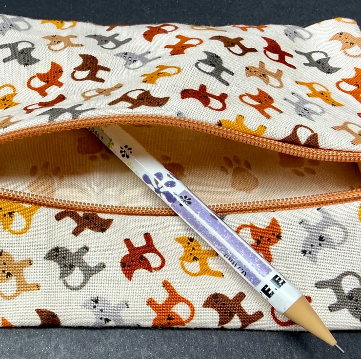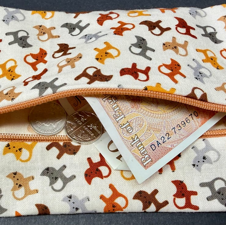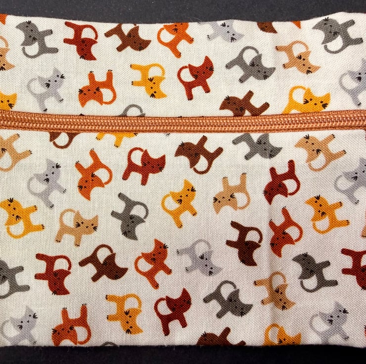 This compact zipped purse is made from a cream cotton dotted with tiny cats in subtle browns, yellows, and greys. The print has a soft friendly feel and the little cats give the purse a lovely sense of character. The front panel is finished with an easy glide mid brown zip that blends beautifully with the warm tones of the fabric.