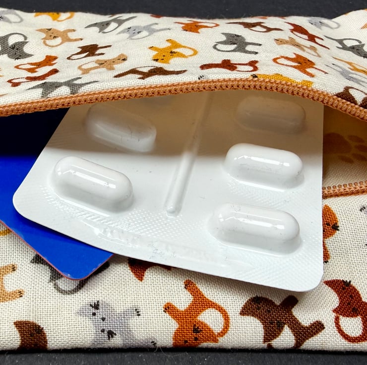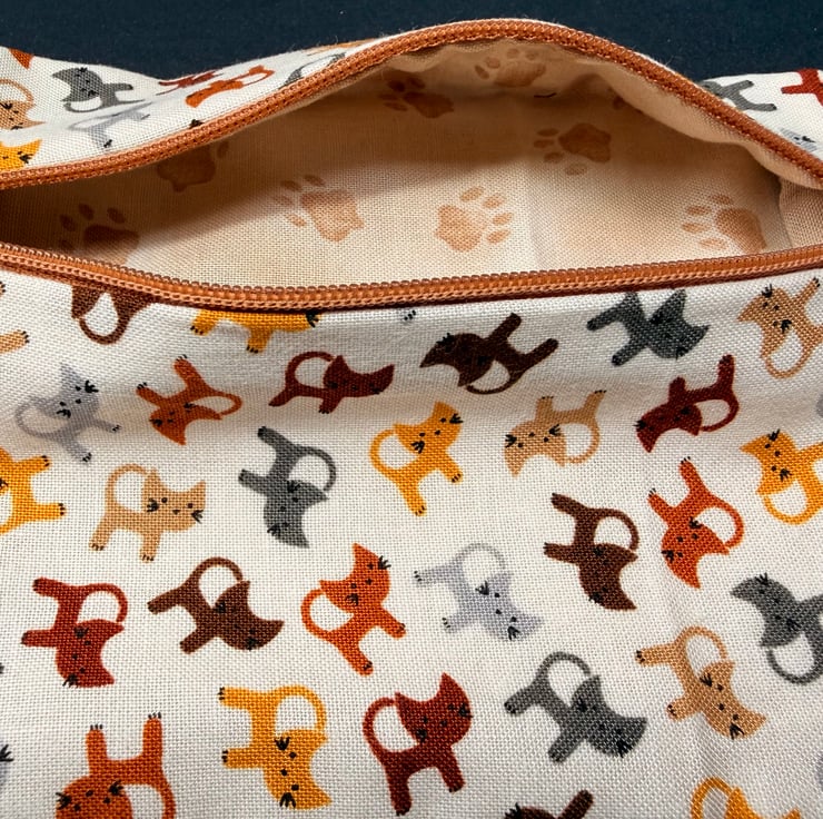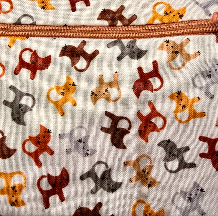 This purse began with the cat fabric which felt gentle and comforting. The miniature cats in soft colours created a warm friendly mood and the paw print lining added a sweet finishing touch. The matching brown zip keeps the palette calm and cohesive. The enclosed seams give the purse a tidy finish and a reassuring sense of durability making it a lovely everyday companion for anyone who loves cats or soft natural tones.