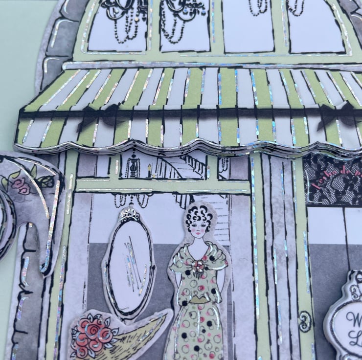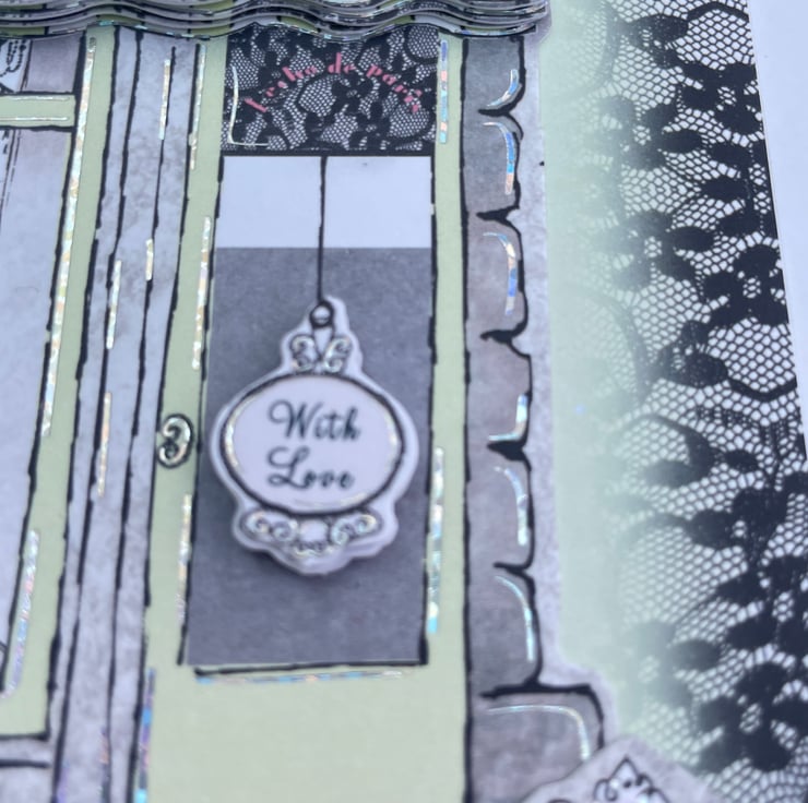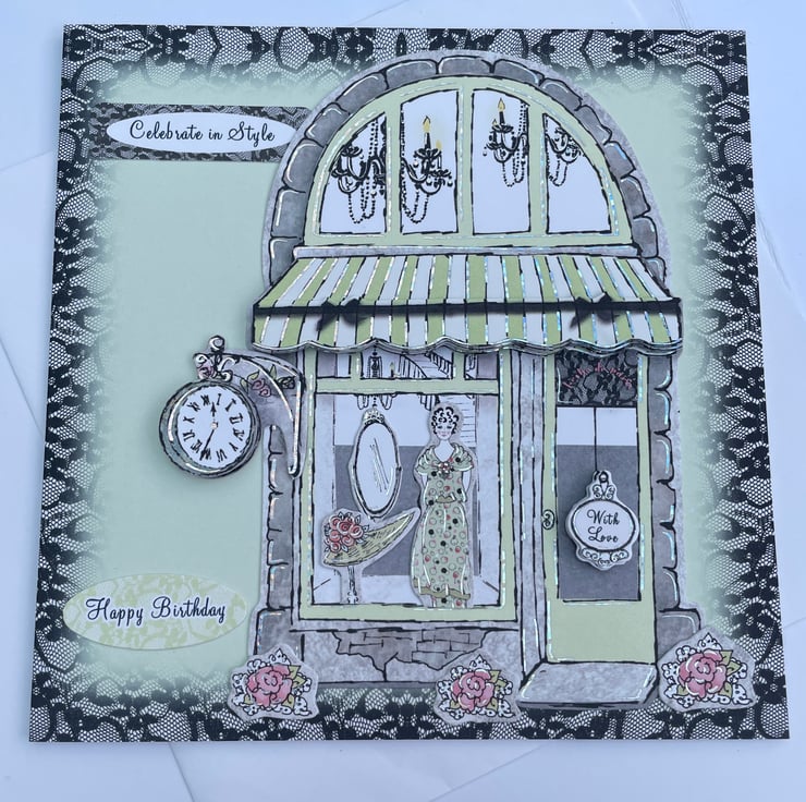 Sophisticated and stylish, a lovely Parisian style birthday card. This 15x15cm card has a pale green background with a printed black lace border. This is decorated with a Parisian boutique shopfront. The shop has a window full of gorgeous items to buy. There are flowers at the front and a clock. The design is decoupaged (layered) to give dimension. The greetings are Celebrate in style, Happy Birthday and the door has a tag which says With Love. Inside is blank for your greeting.
