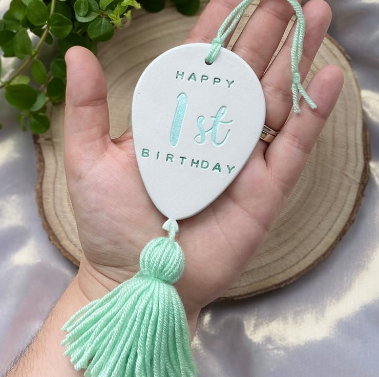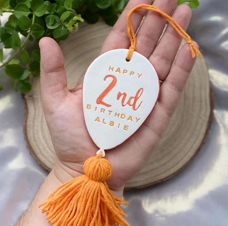 Celebrate a special birthday with this personalised balloon ornament, hand stamped and hand painted using air dry clay. Finished with a coordinating handmade tassel, this custom birthday decoration can include an age and optional name to create a meaningful keepsake to treasure long after the celebration.