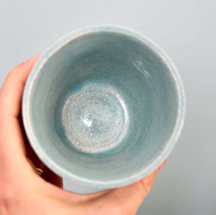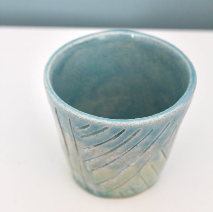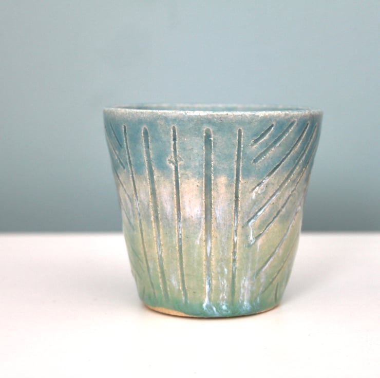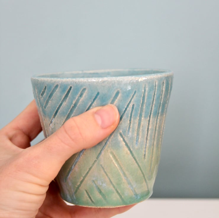 Blue and green wheel thrown ceramic mug with a geometrical pattern engraved. The mug is fired to c1200 degrees (stoneware temperature) which makes it durable and suitable for everyday use.