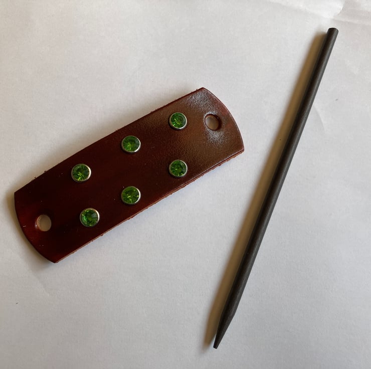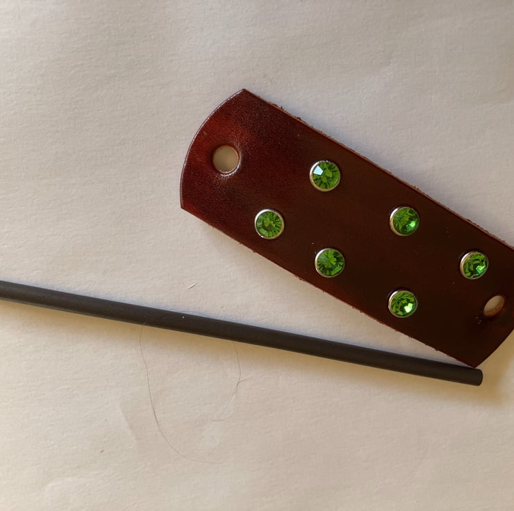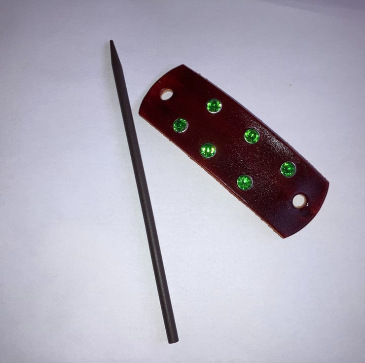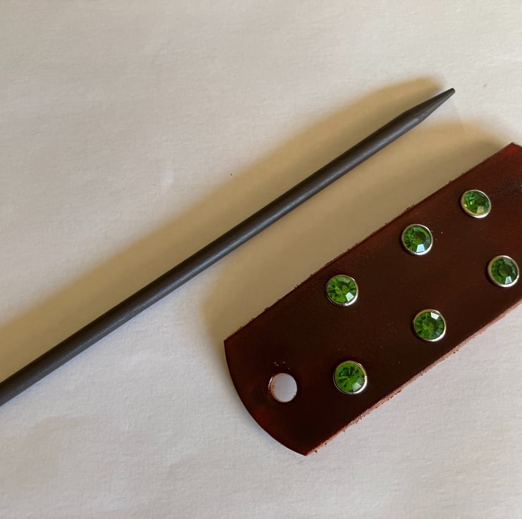 The black wood hair stick is 6" in length. 6 Green coloured Gemstones are riveted onto the leather. (see backside of hair stick barrette)