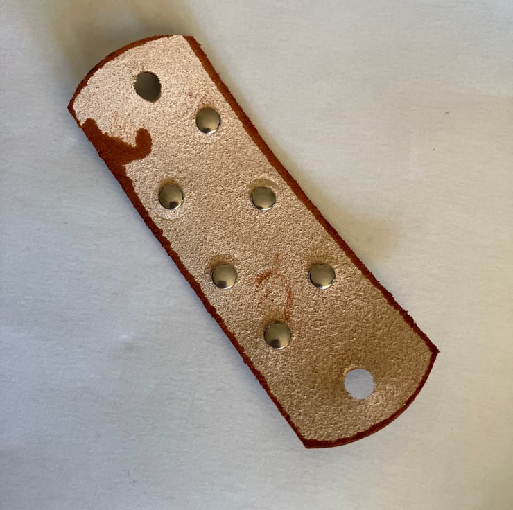 Shape: Rectangle ... Size: roughly 4” ... Hand dyed Brown // acrylic finishing spray to seal in leather dye