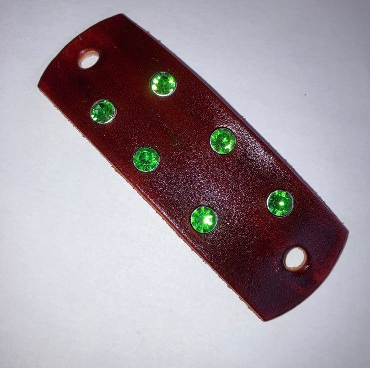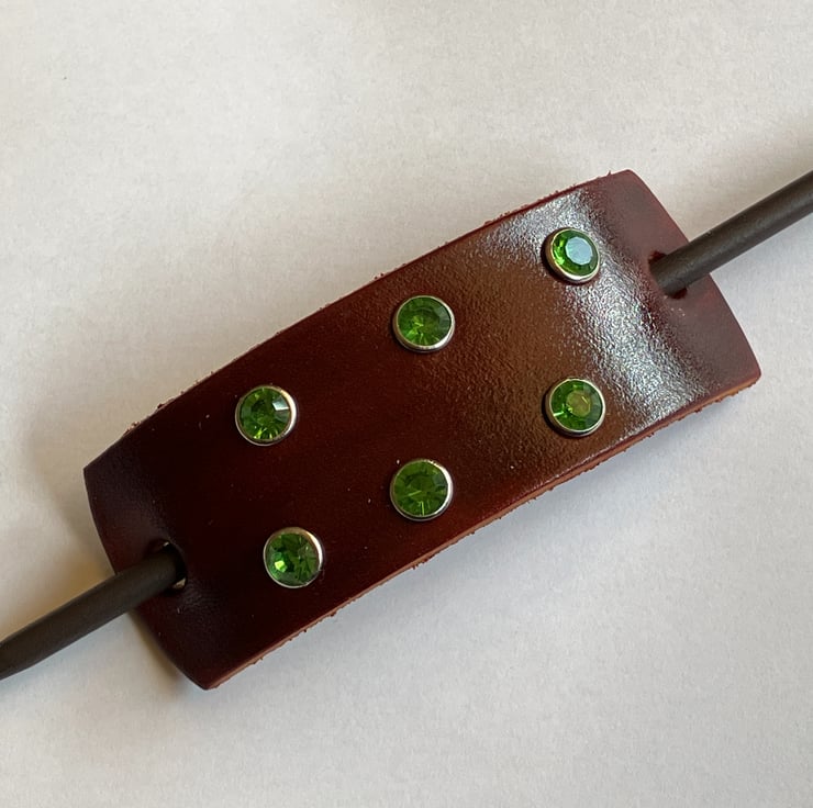 Dyed Brown Leather Hair Stick Barrette - with 6 Green Gemstones