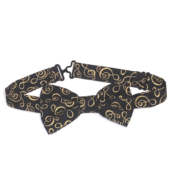Classic styling is possible with this black and gold treble clef print, adjustable bow tie.