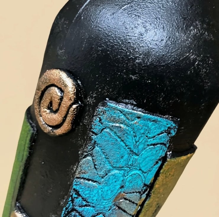 Features a rich variety of textures, from the "reptilian" teal inlay to the weathered bronze band around the neck.