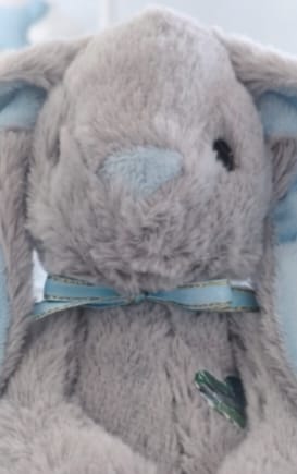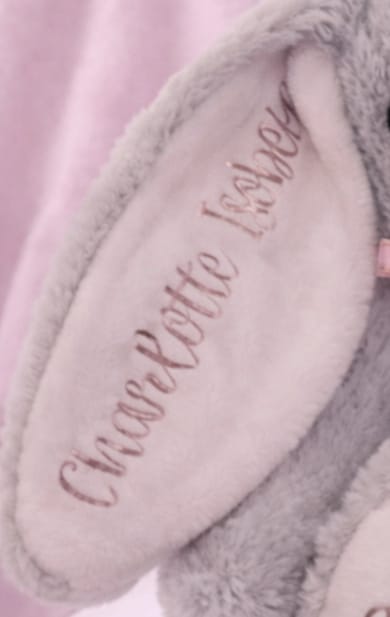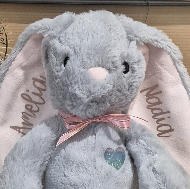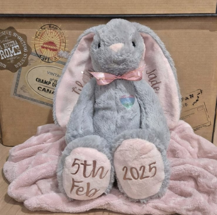 Soft plush bunny toy - length is 27cm. Grey bunny with either pastel pink, pastel blue or white ears and feet. Personalised by hand using HTV (Heat Transfer Vinyl, soft and durable).