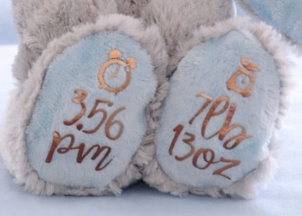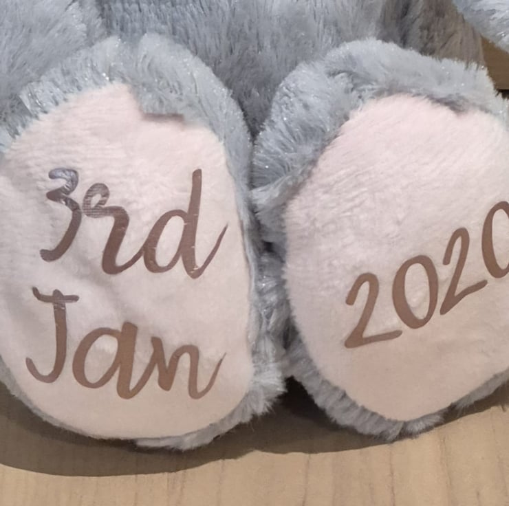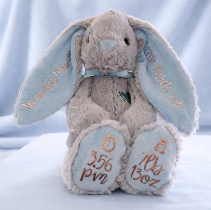 Each bunny is customised by hand with the child's name(s), date, weight and time of birth, making every piece unique and special.