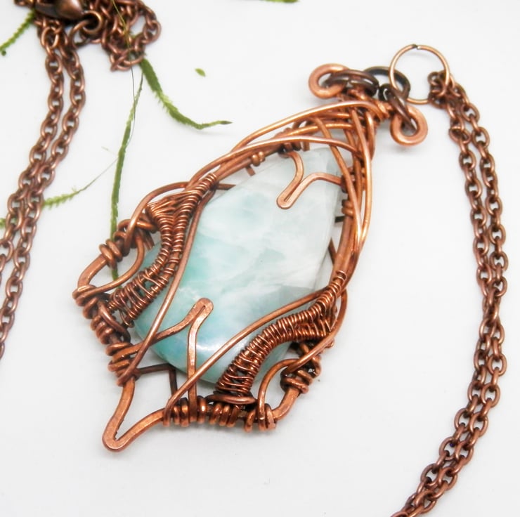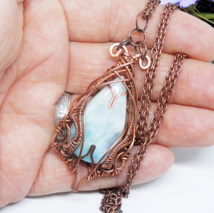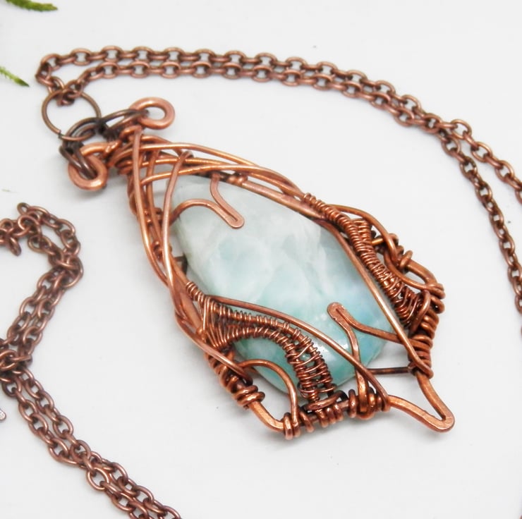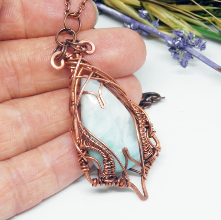 This is a beautiful wire wrapped Necklace, made using copper wire that has been wrapped lovingly in an Elven style around a striking piece of Larimar.