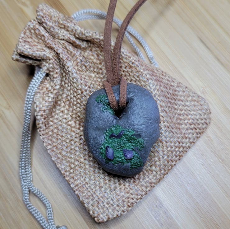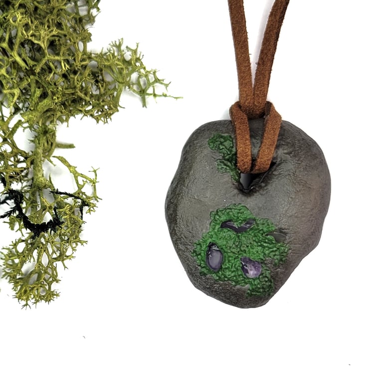 Individually hand sculpted polymer clay pendant. Natural moss covered stone design with inset amethyst chips. Adjustable suede cord. Each piece is truly unique, all original designs, no moulds used.