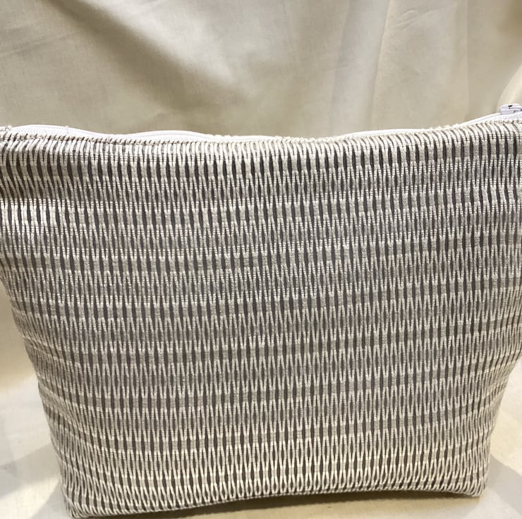 An unusual and luxury looking silver grey fabric has been used for this travel set. Consists of a shoe / multi purpose bag with carry handle, 44x35cm excluding handle, and a room toiletry / cosmetic bag with quilted lining, 27x22cm. Grey lining. Soft synthetic fabric, hand washable at 30 degrees. Only one set made so unique to you.