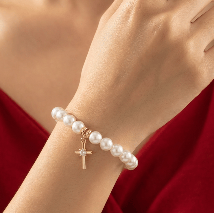 Handmade with love and care using only the finest materials. Beautiful stretch faux pearl beaded bracelet with gold plated spacers. Personalised with a clear letter gold initial bead and finished with a stunning crystal 18k gold plated cross charm.