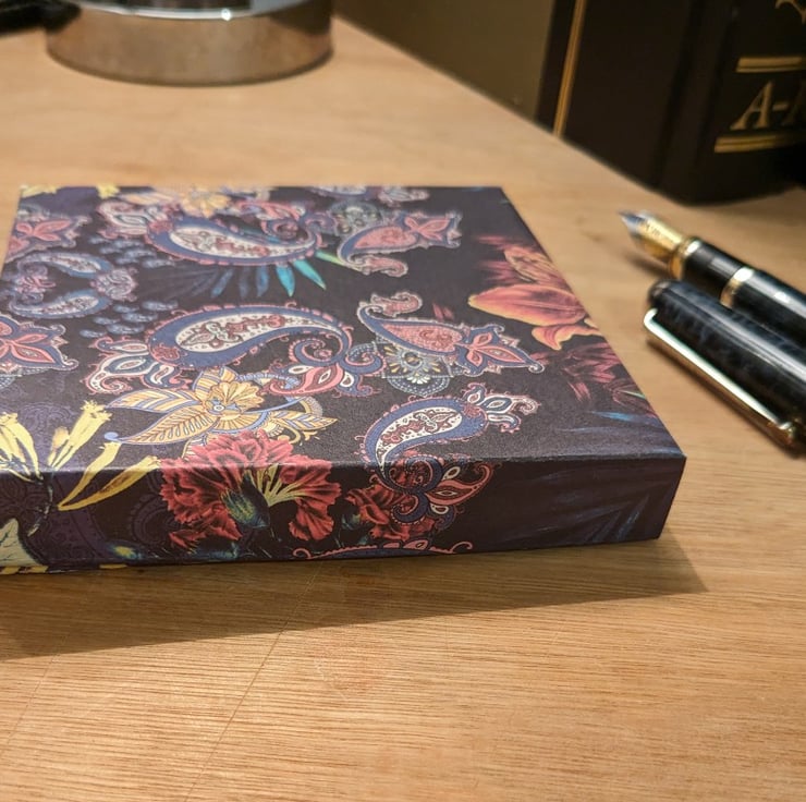 The box is complete and ready to use, requiring no further assembly, and the paper completely covers the exterior and interior of both the lid and the base with no cardboard showing. It measures 10.6cm square closed. Outside height is 1.7cm and internal box depth is 1.5cm. Ideal for all items not requiring a deep box, such as delicate jewellery pieces, silk scarves, embroidered handkerchiefs, etc.