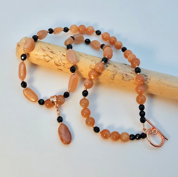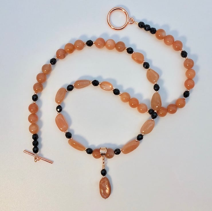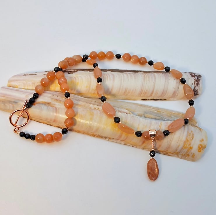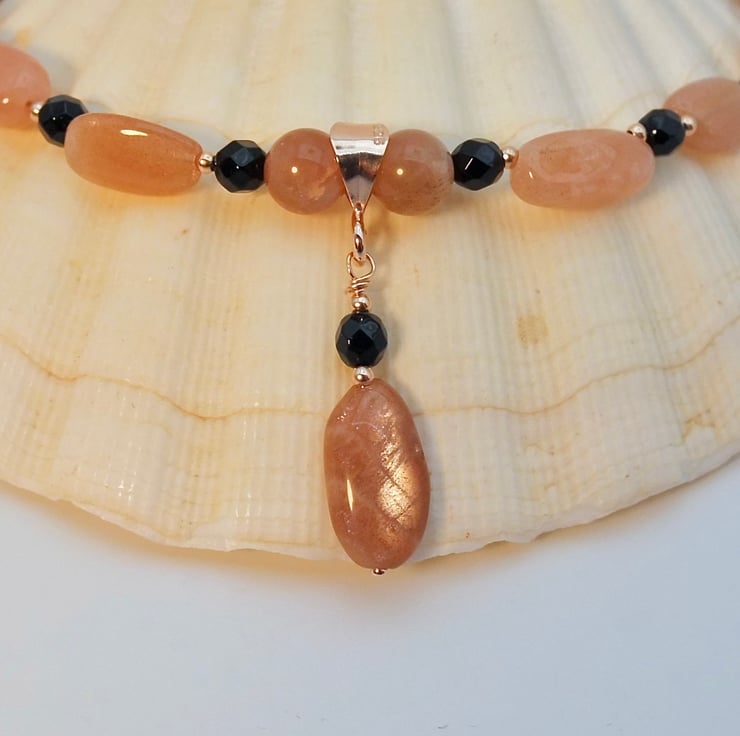 The pendant hangs from a rose vermeil bail set between a pair of 6mm Sunstone beads, in the centre of ten Sunstone nuggets that are separated by 4mm faceted black Onyx and 1.8mm rose vermeil spacers.