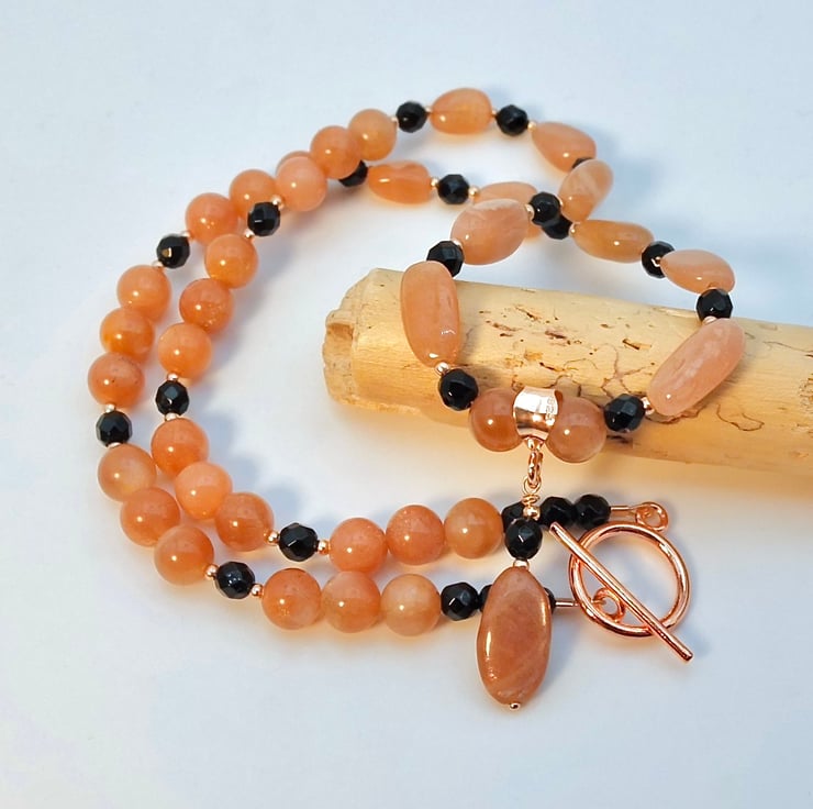 The necklace graduates to trios of 6mm Sunstone beads separated by more faceted black Onyx and rose vermeil beads.