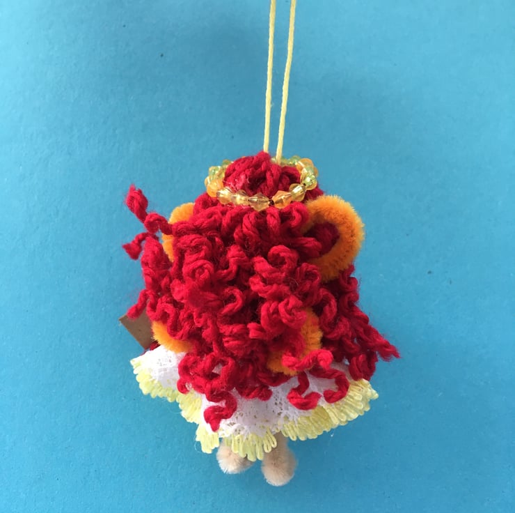 She has a pipe cleaner body and a wooden bead head with carefully hand drawn features, which gives her a unique expression.