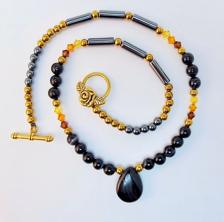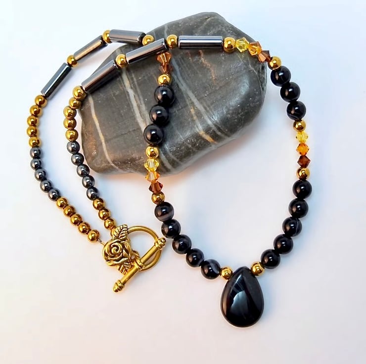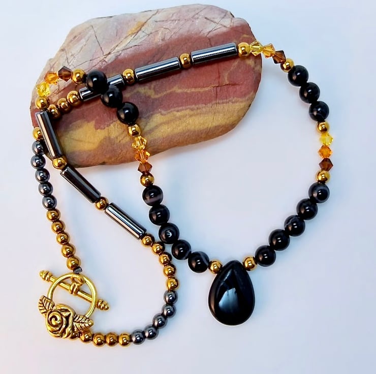 The teardrop is flanked by 6mm round, black Onyx beads highlighted with 4mm golden hematite and trios of sparkly Austrian crystal bicones in the colours 'smoked topaz', 'topaz' and 'light topaz'.