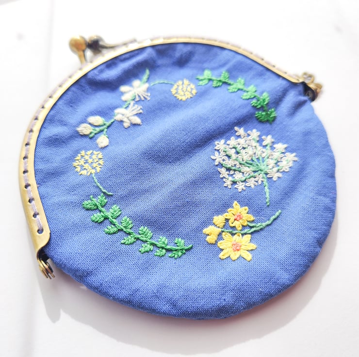 The front features a delicate floral wreath design, carefully stitched by hand. The rounded shape gives the purse a slightly unusual and charming silhouette.