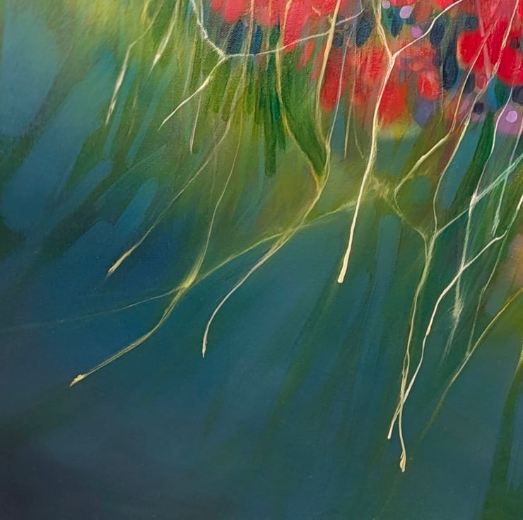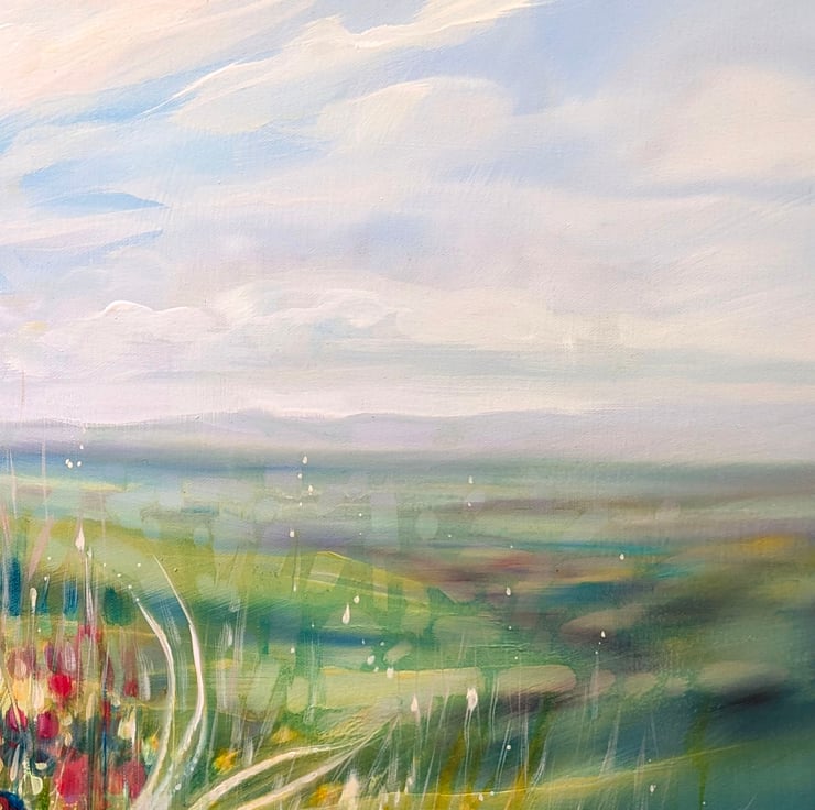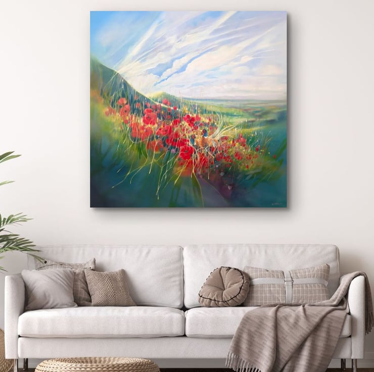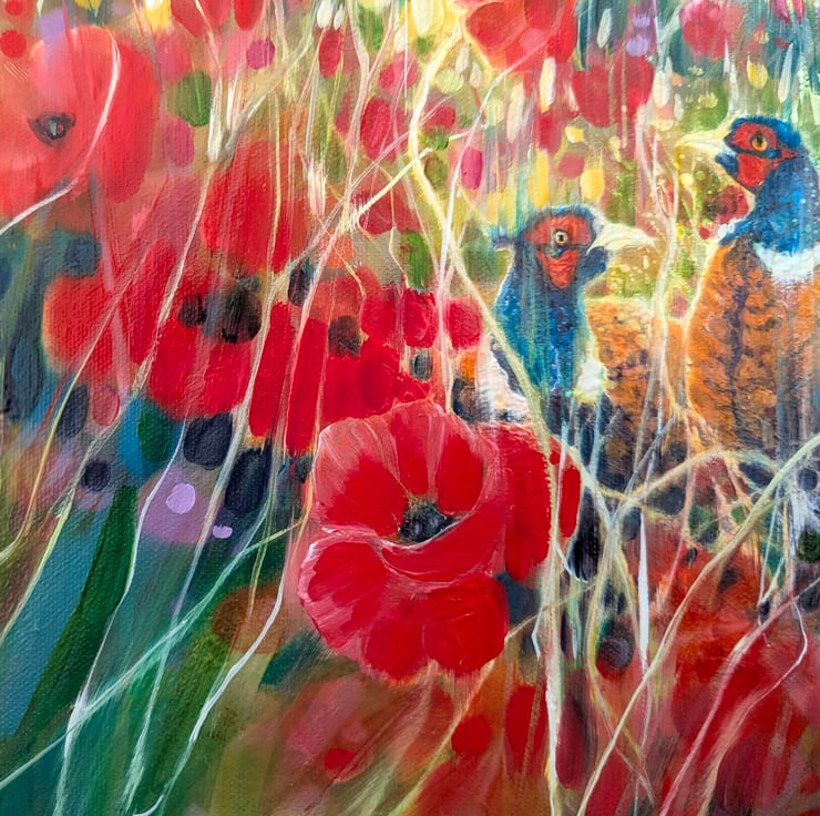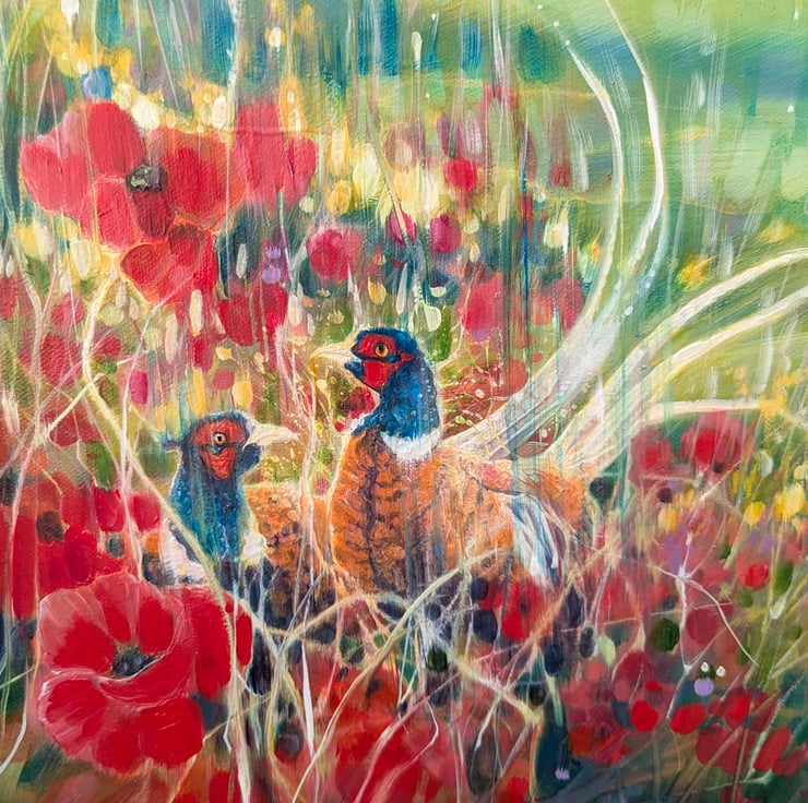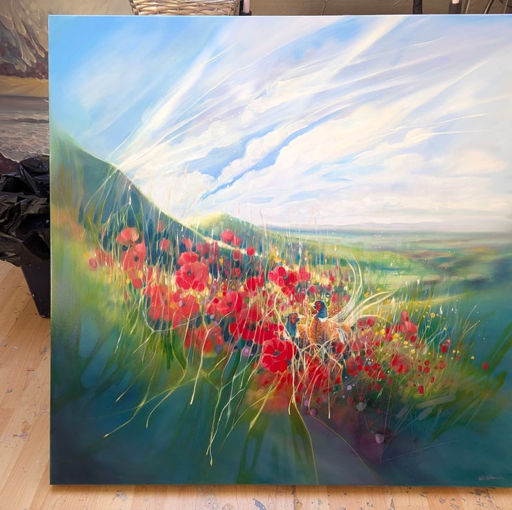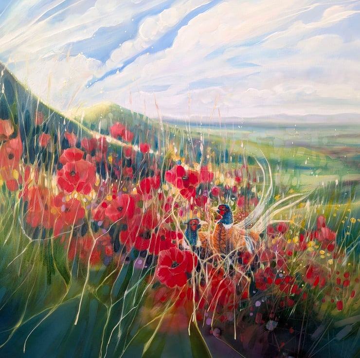 A Timeless Magic is a semi-abstract South Downs inspired landscape painting with red poppies and pheasants. It is 36x36x1.5 inches. The painting pays tribute to my many walks up and down the hills of East Sussex which is always breath-taking. This spot is near Ditchling and was made mostly from my memory of a late summer afternoon walk. There is a timelessness to hills as they have not changed as much as the other landscapes of England have. Spotting pheasants among poppies was a beautiful thing to see and I am happy to have caught this moment in time. The various layers and paint glazes give the overall impression of this scene being realistic but also strange when you look closer. Painted on deep edge canvas, white edges, ready to hang and comes with certificate of authenticity.