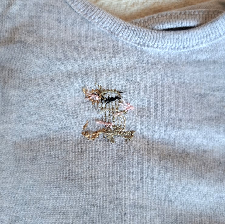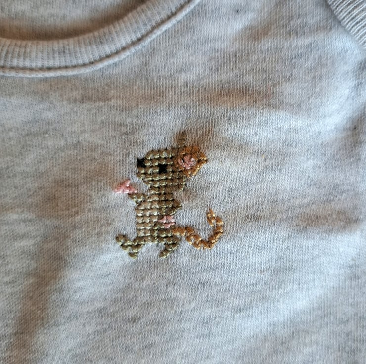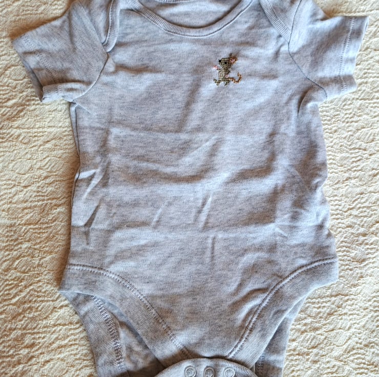 I have hand embroidered a small brown mouse on the left side of this lovely pale grey baby vest/onesie. As I never use a permanent backing fabric when stitching kids' clothing, there is nothing inside to irritate your child's skin. The vest has an envelope neck, short sleeves and three press studs between the leg openings. It is all cotton and can be machine washed.