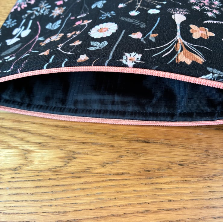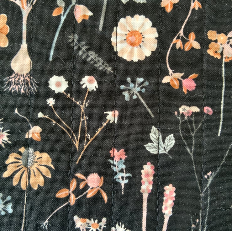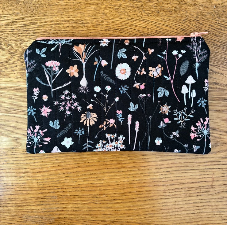 The pouch features a flower, plants and mushrooms print on a black background. The pouch is quilted with black stitching.