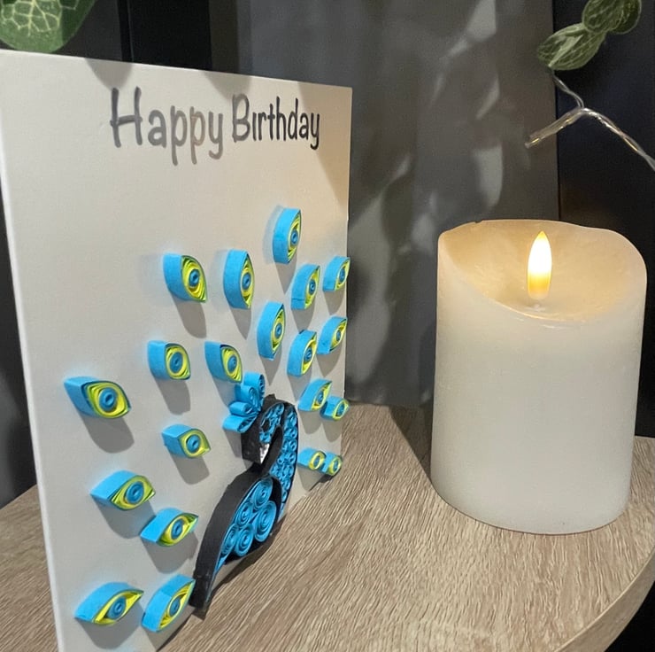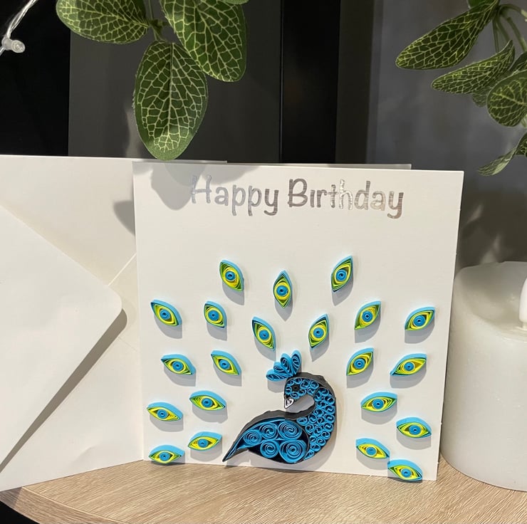 Beautifully hand crafted 15cm x 15cm card featuring an intricate quilled peacock design.