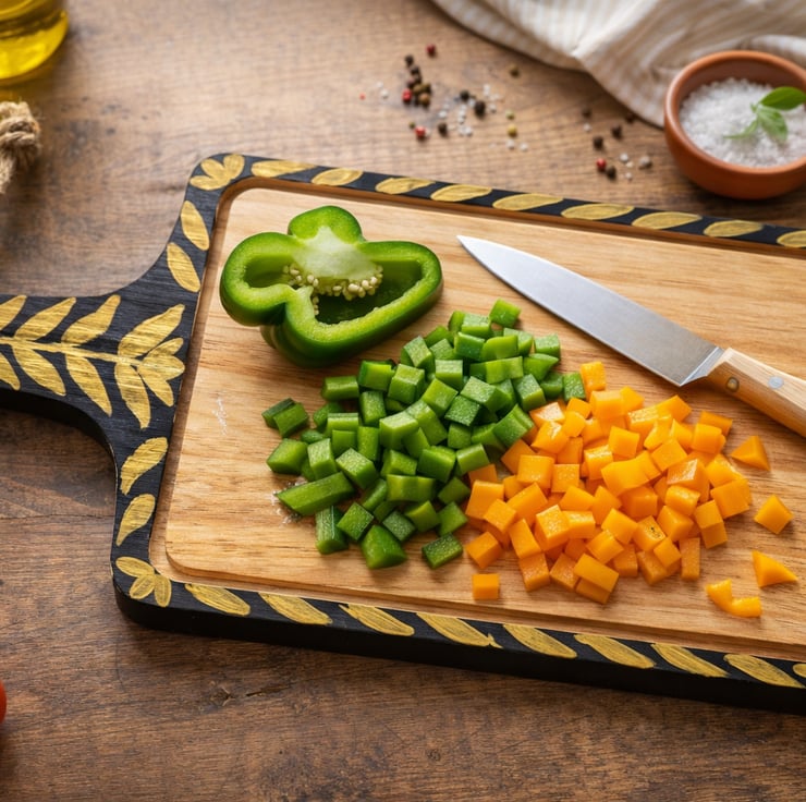 The painted design is applied only to the border, while the main central surface remains natural wood. This thoughtful design helps minimise the risk of food contamination, making the board suitable for both food preparation and serving.