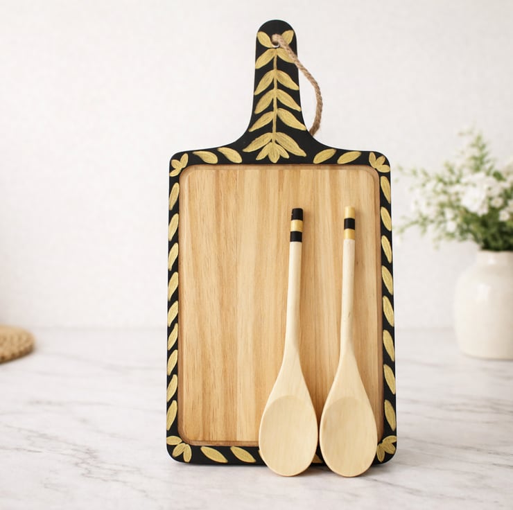 Every board comes with a matching set of 2 wooden spoons, also hand painted in coordinating colours to create a stylish and cohesive kitchen set.