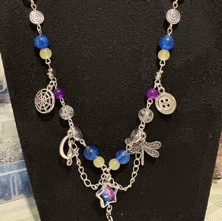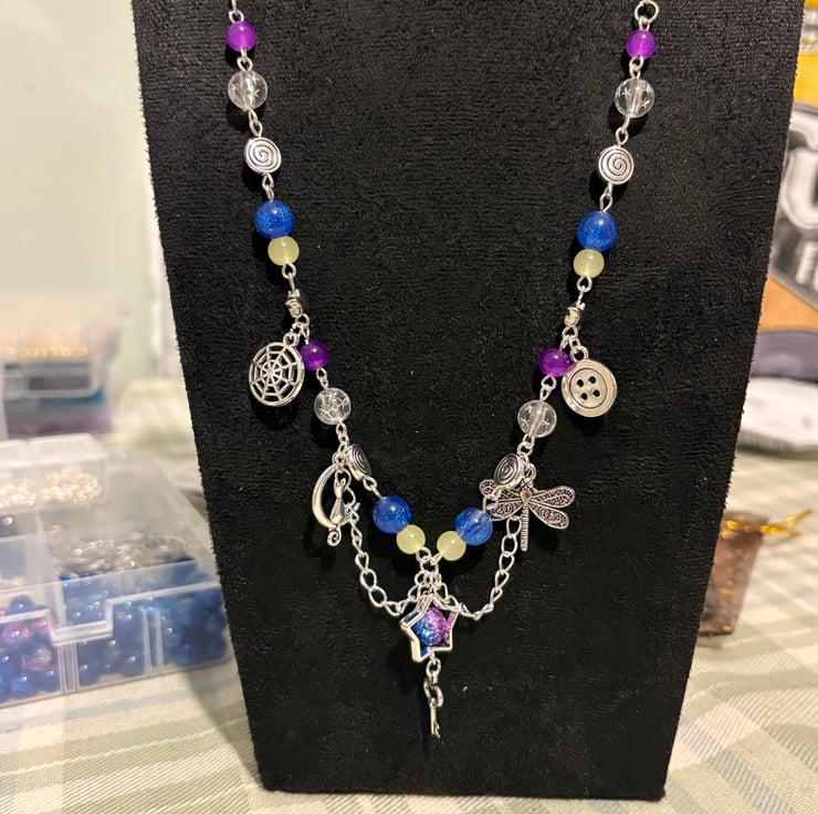 Handmade necklace inspired by the Coraline movie. Adorned with beads and charms that capture the movies aesthetic perfectly