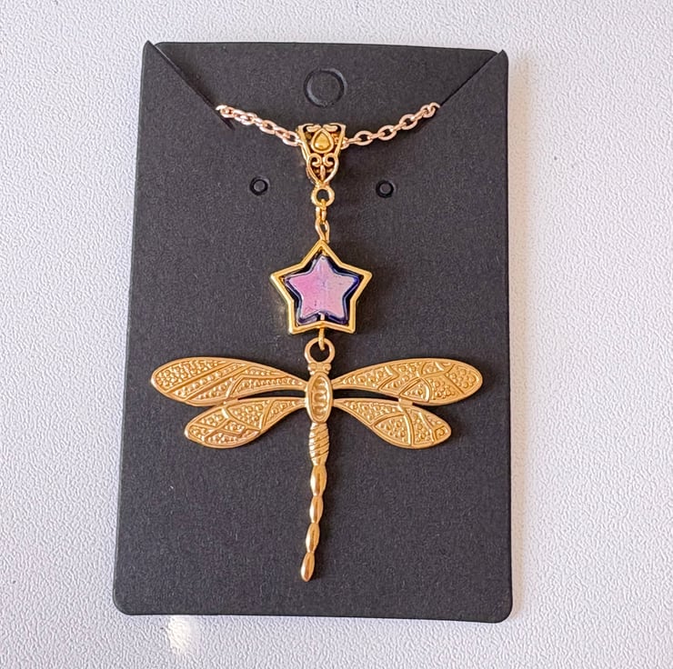 Above the dragonfly sits a dainty star charm in soft purple-blue, adding a subtle pop of colour and a hint of magic to the piece. The combination of the star and dragonfly gives this necklace a dreamy, nature-inspired feel—perfect for those who love unique, feminine jewellery.
