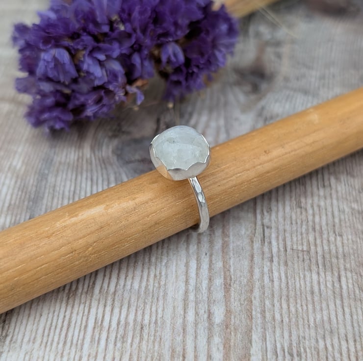 This Silver Moonstone Ring is handmade from recycled sterling silver, with a gently hammered band that gives it a subtle, natural texture. The setting has been made by hand to hold a round moonstone, keeping the shape soft and organic. Moonstone is known for its soft glow and flashes of light, often showing hints of blue as it moves, and is linked to calm, balance, and new beginnings. This ring is easy to wear every day and would make a thoughtful gift for a milestone or a meaningful moment.