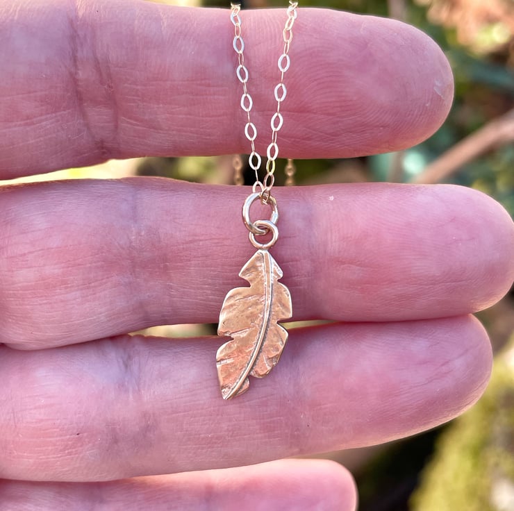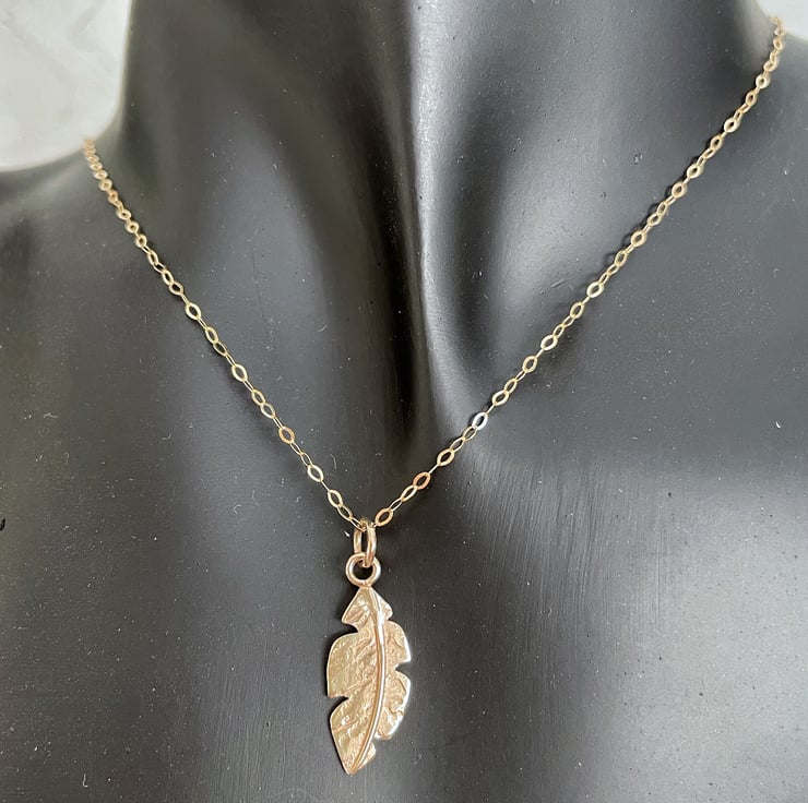 A handmade yellow gold feather hangs from an 18” 9ct gold chain.