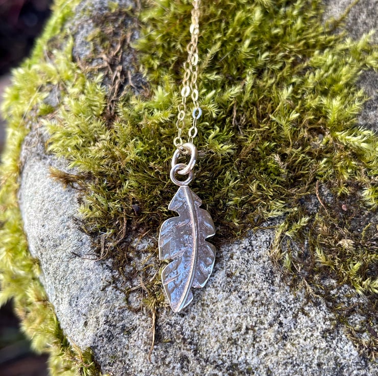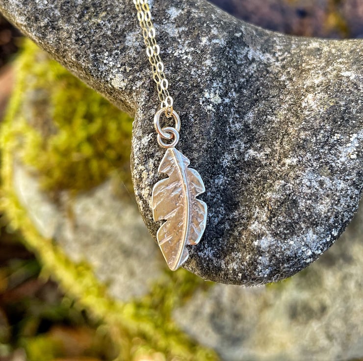 This little feather hangs 2.5cm long with the bail and is 8mm at it’s widest. The chain is a lightweight hammered trace chain that closes with a small bolt ring.