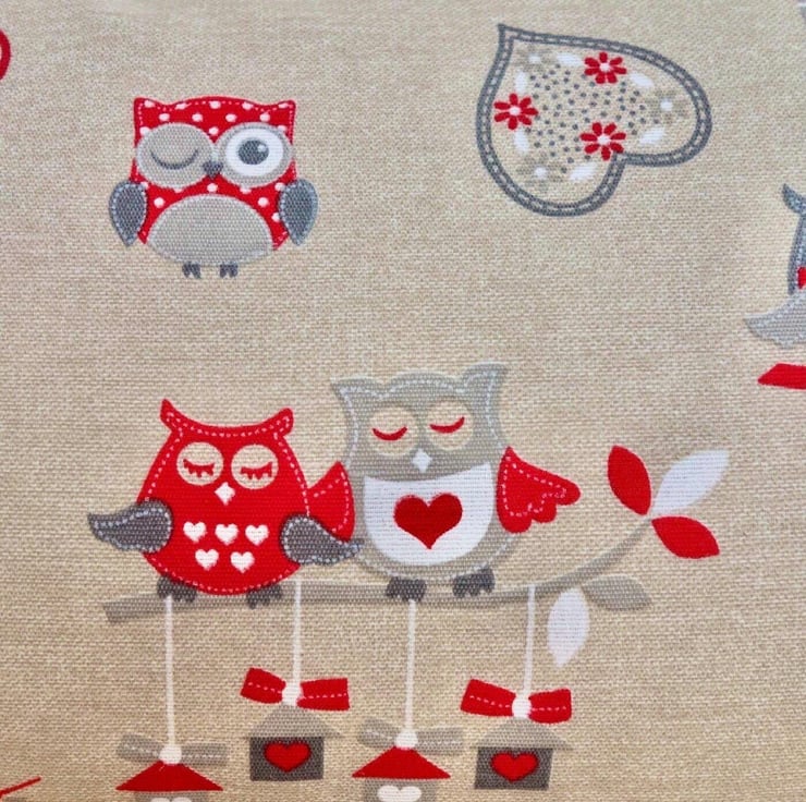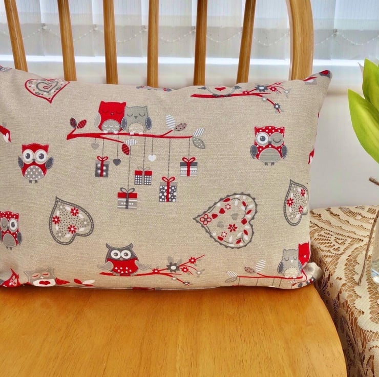 Oblong Cushion Cover - Character Red Owls design on a Beige background, double sided.