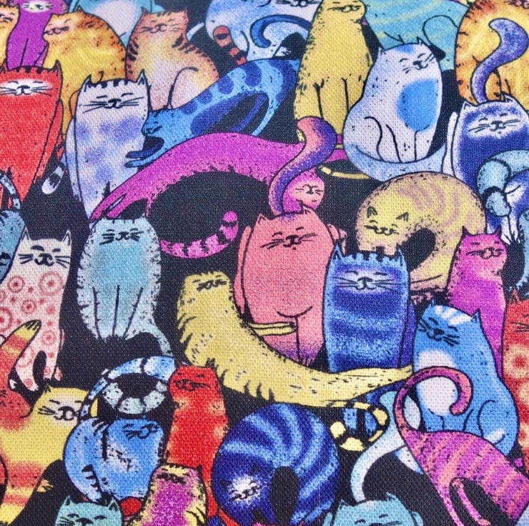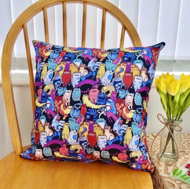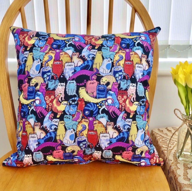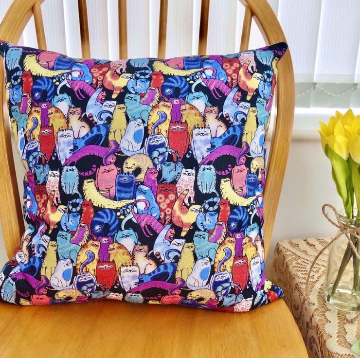Cushion Cover - Purple & Multi coloured Cats design on a Black background, double sided.