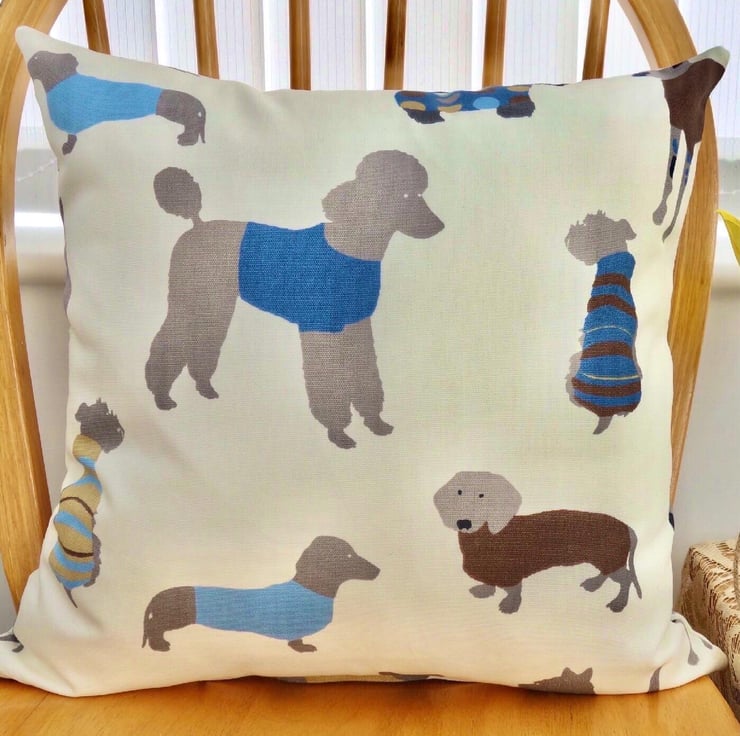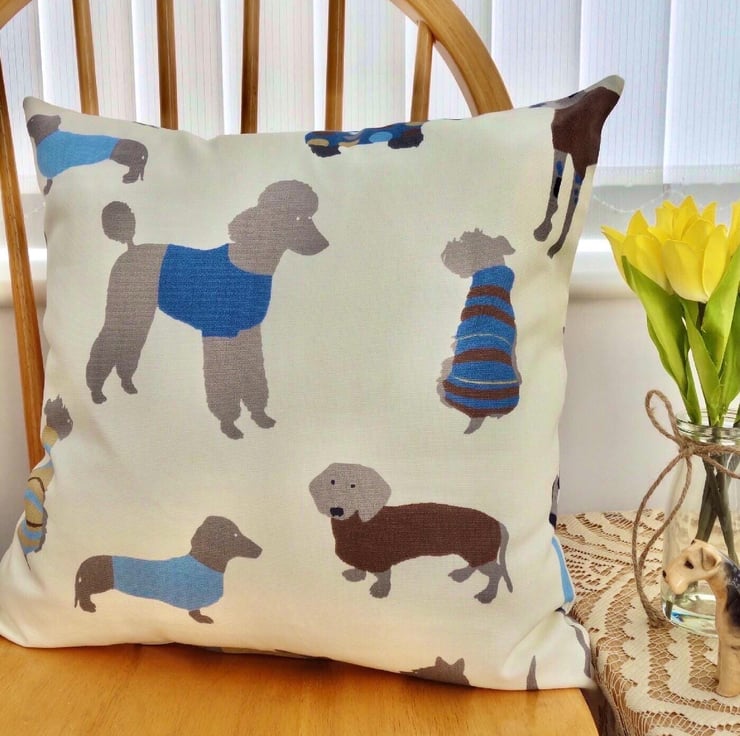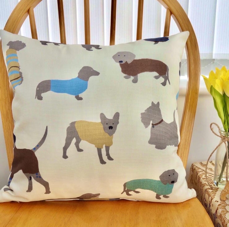 Cushion Cover - Dogs dressed in jumpers design on a Cream background, double sided.