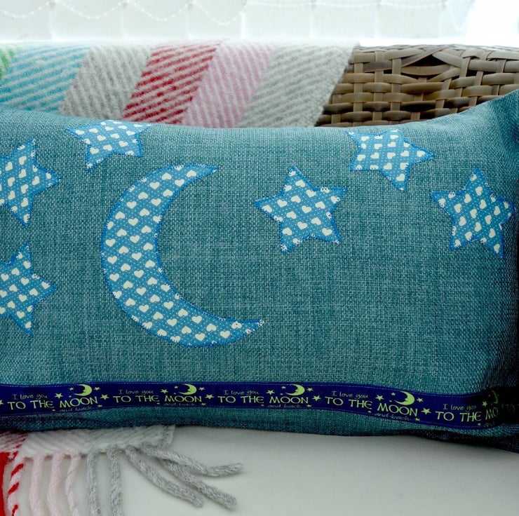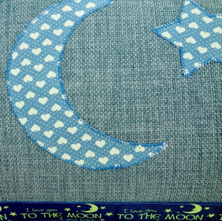 Handmade Appliqué Cushion with a Moon and Stars in a Blue heart design fabric on a medium Blue linen look fabric. Decorated with Deep Blue grosgrain ribbon with Moon and Stars and the words: I love you to the moon and back, in Yellow.