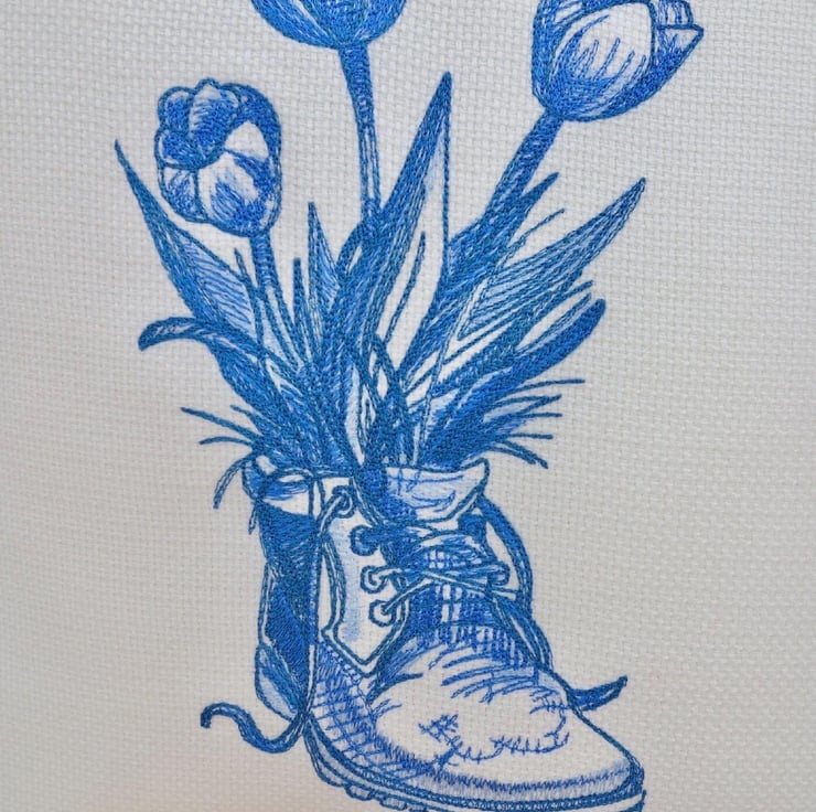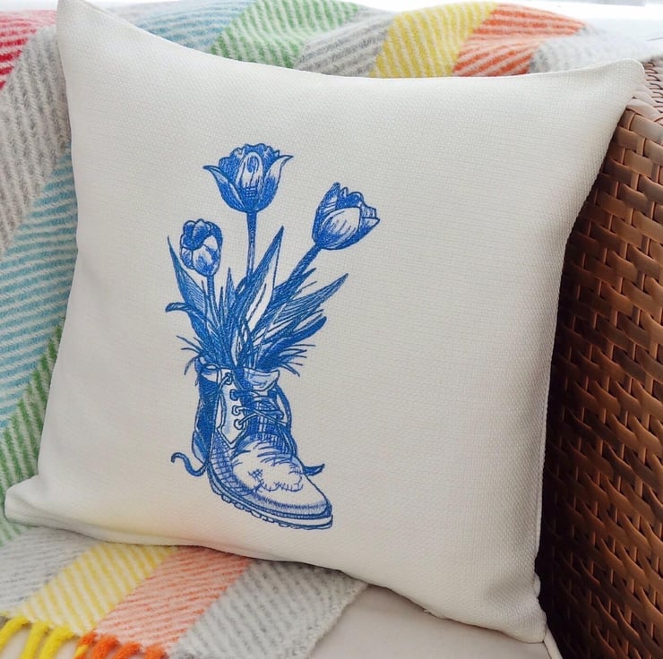 Handmade in a Light Cream fabric, machine embroidered with an Old Boot filled with Flowers in shades of Blue thread.
