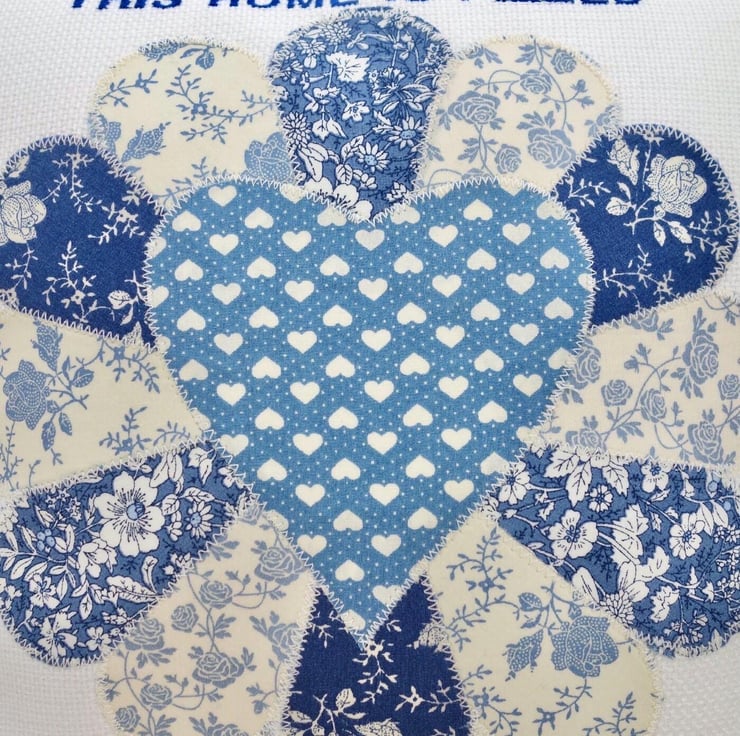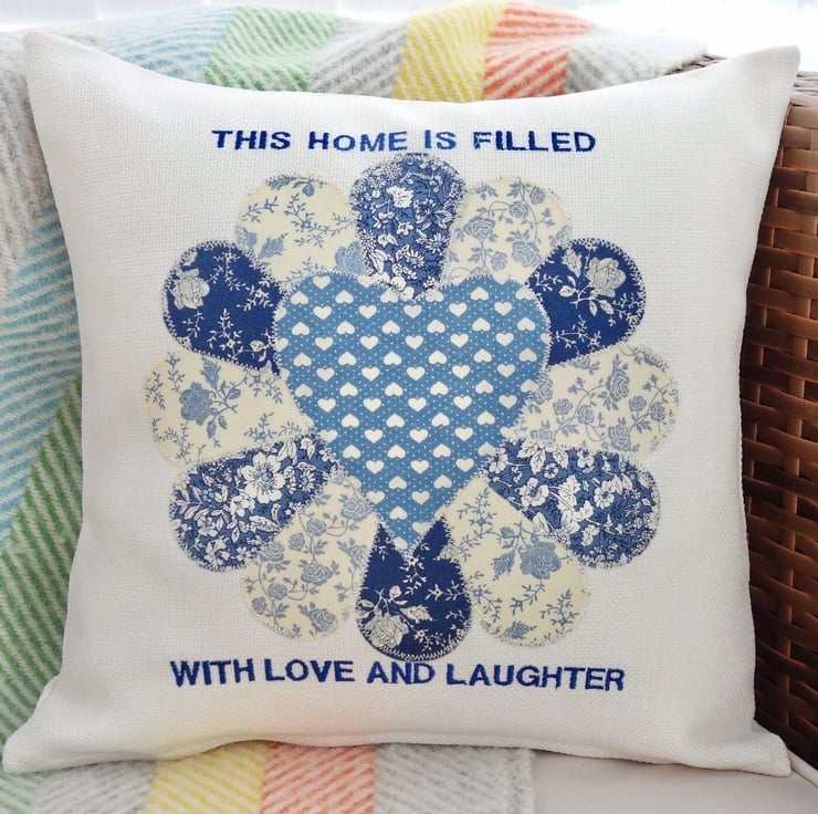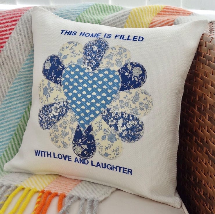 Handmade in a Light Cream fabric, Appliqué fabric Dresden Flower design in shades of Cream and Blue, machine embroidered with the words: This home is filled with love and laughter. of Blue thread.