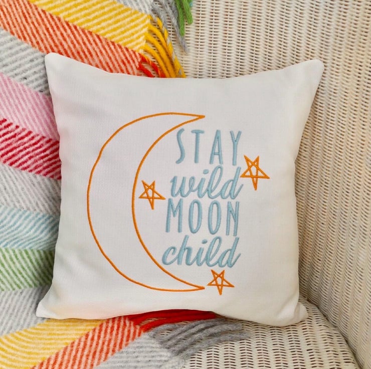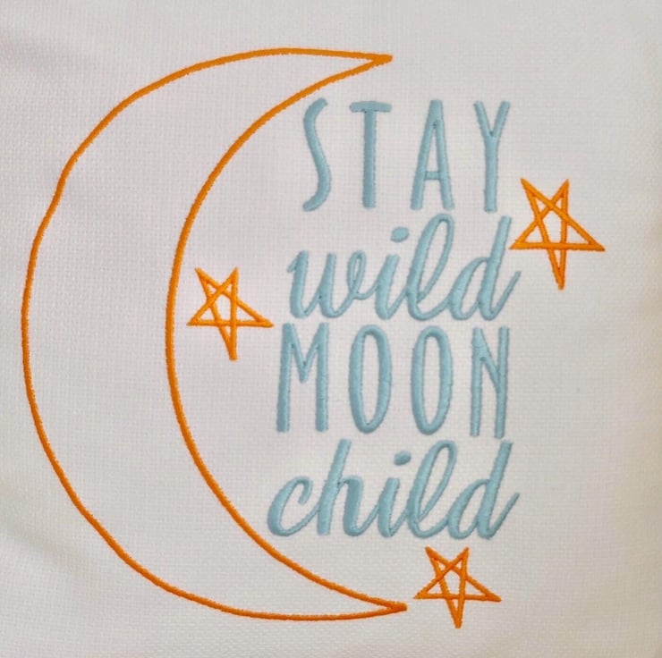 Handmade in a Light Cream fabric, machine embroidered with a Moon and Stars and the words: Stay Wild Moon Child, in Blue and Yellow thread.