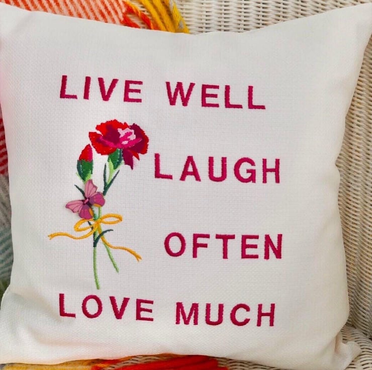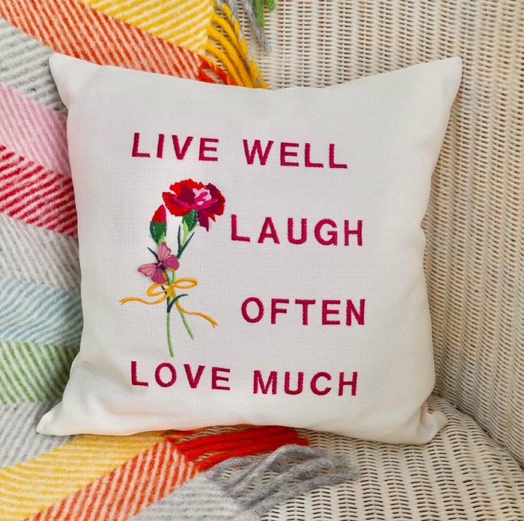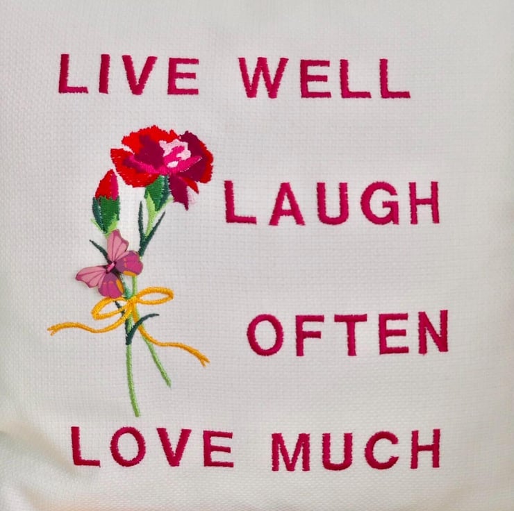 Handmade in a Light Cream fabric, machine embroidered with a posy of Carnations and the words: Live well, laugh often, love much, in Pink thread.