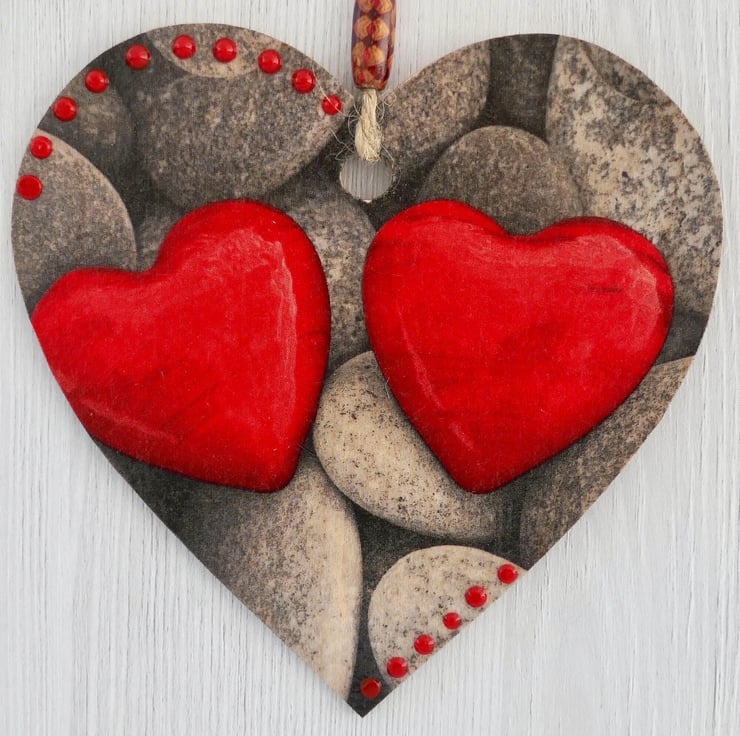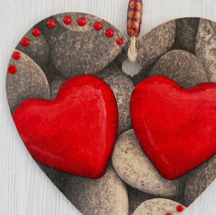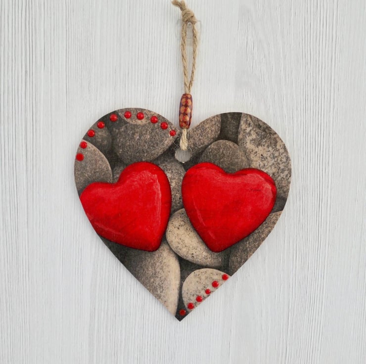 Decoupaged Wooden Hanging Heart: Pebbles design 15cm