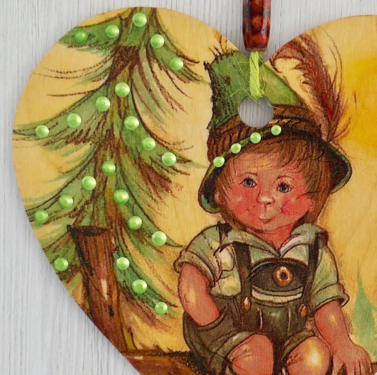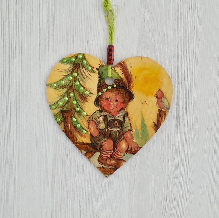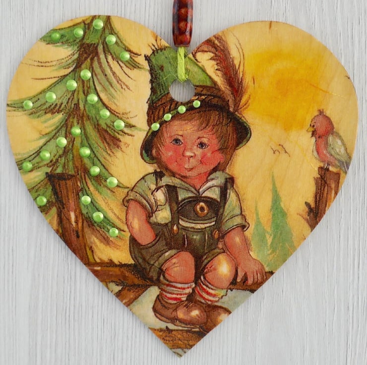 Decoupaged Wooden Hanging Heart: Tyrollean Boy design 15cm