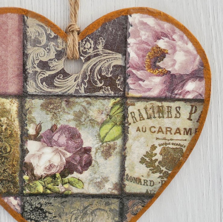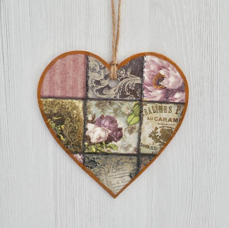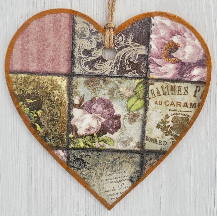 Decoupaged Wooden Hanging Heart: Vintage Rose design 15cm