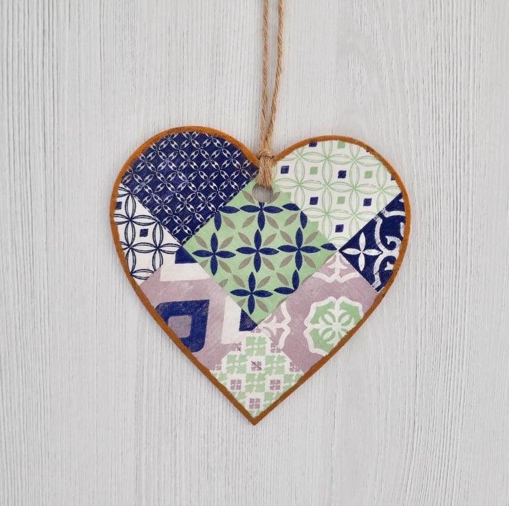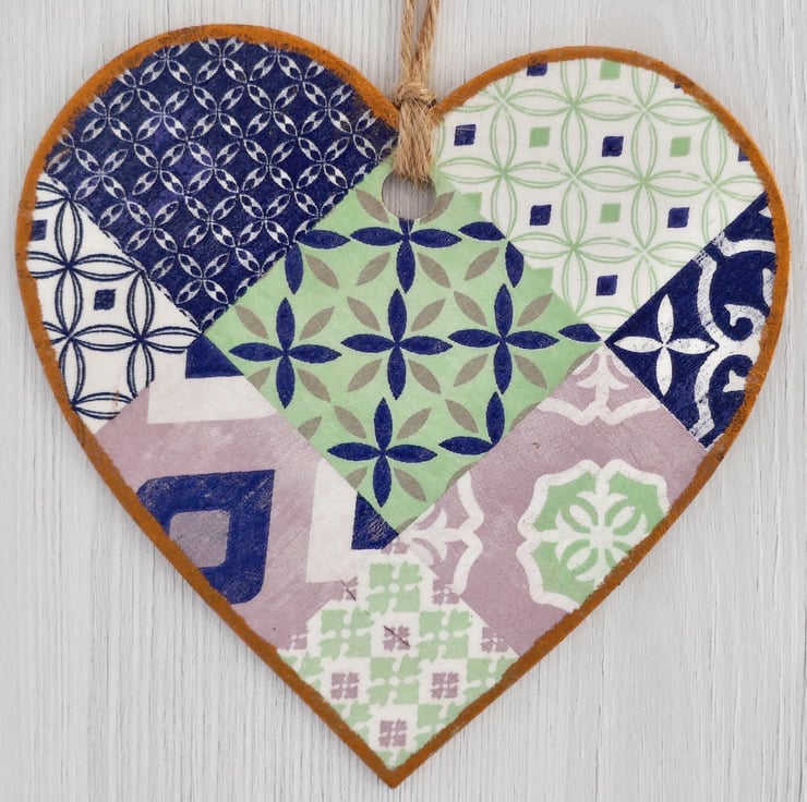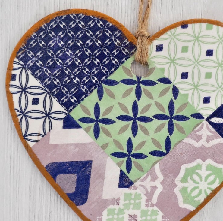 Decoupaged Wooden Hanging Heart: Green and Blue design 15cm