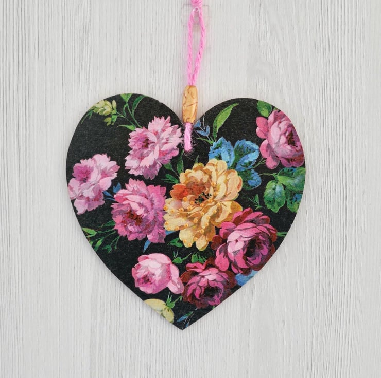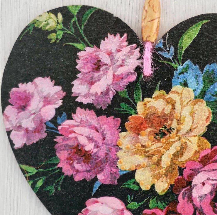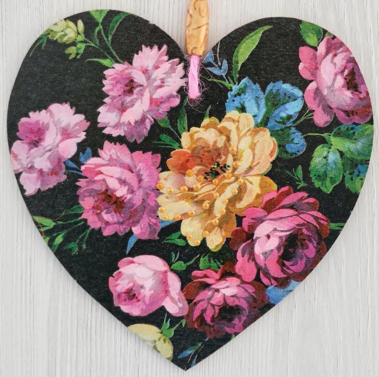Decoupaged Wooden Hanging Heart: Pink and Yellow Rose design 15cm