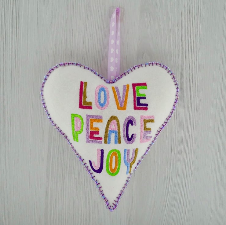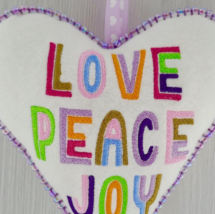 Love Peace Joy design Embroidered Felt Hanging Heart with beaded edge, on a Light Cream background. Machine embroidered with the words: Love, Peace, Joy in rainbow colours.